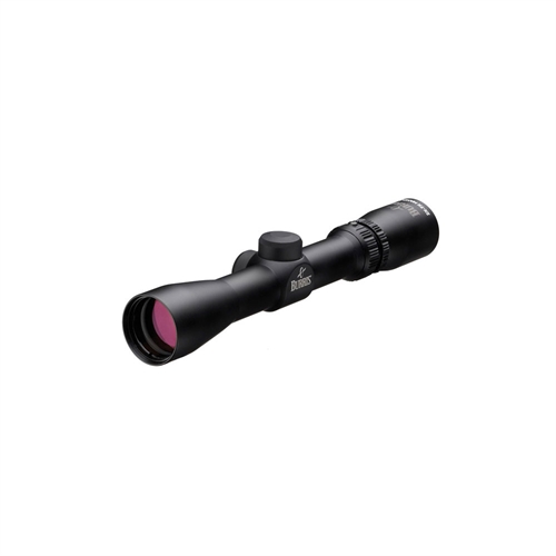 This Burris 2x-7x-32mm handgun scope has a plex reticle, matte black finish, multi-coated lenses, long eye relief, 21 ft low - 7 ft high field of view at 100 yards, 1/4" click value at 100 yards, and a 64" adjustment range at 100 yards.