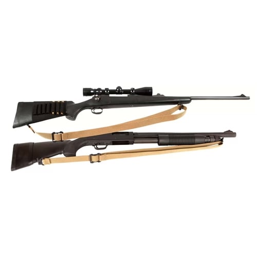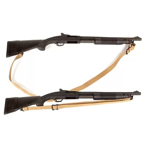 Shown as a Mossberg 590 sling, this hunting shotgun sling will work with similarly built shotguns with a sling swivel stud on the front and back.